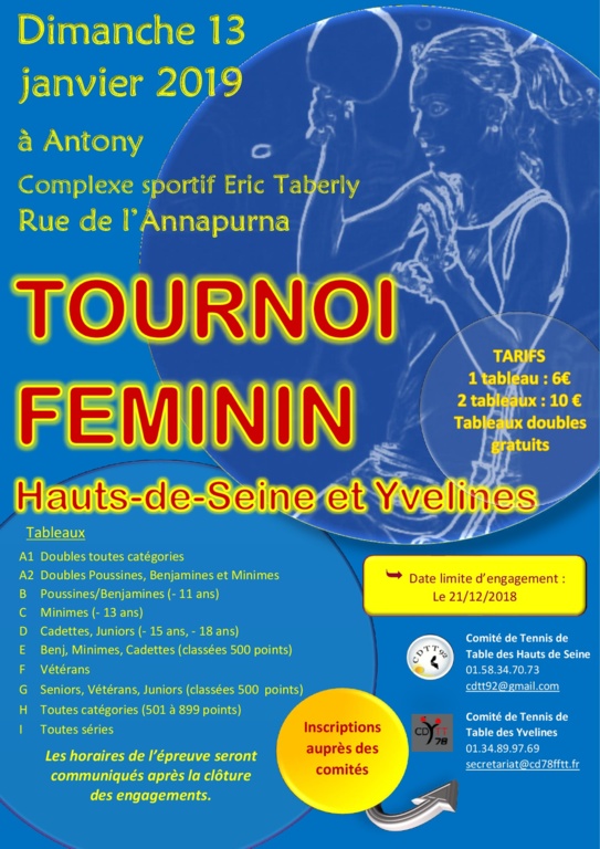 Chaque joueuse doit s'inscrire obligatoirement dans le tableau correspondant à sa catégorie d'âge (ou de classement pour les seniors-vétérans) et éventuellement dans un 2e tableau en respectant les consignes données dans le règlement page 2.